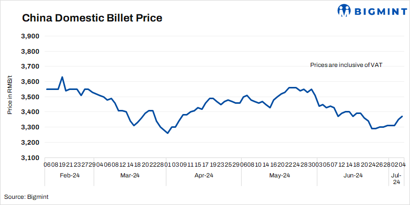 - Billet prices in Tangshan edged up by RMB 20/t ($3/t) d-o-d to RMB 3,370/t ($464/t) on 4 Jul’24. Prices include 13% VAT.
