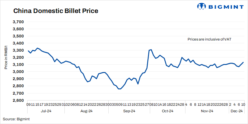 - Steel billet prices in China’s Tangshan rose RMB 30/t ($4/t) d-o-d to RMB 3,130/t ($431/t) on 10 Dec’24. Prices include 13% VAT.