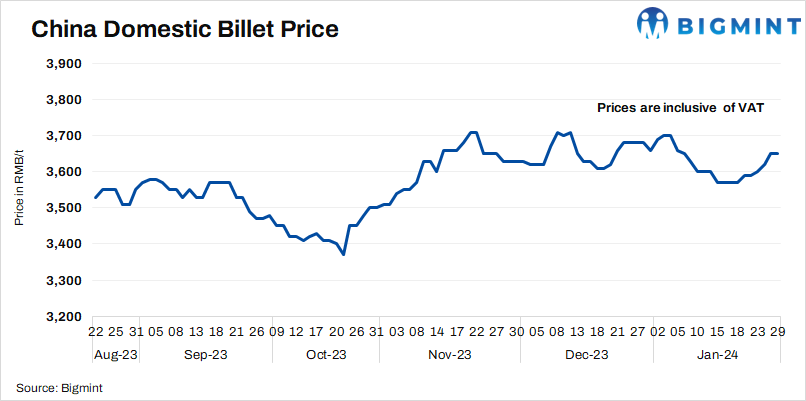 • Billet prices in Tangshan remained stable at RMB 3,650/t ($508/t) on 29 Jan’24 against 25 Jan. Prices include 13% VAT.