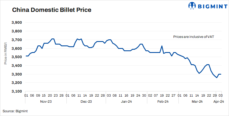 • Billet prices in Tangshan remained stable d-o-d at RMB 3,300/t ($456/t) on 3 Apr’24 . Prices include 13% VAT.