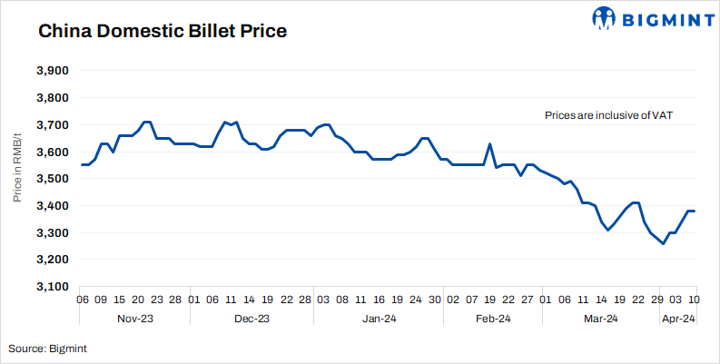 - Billet prices in Tangshan remained stable d-o-d at RMB 3,380/t ($467/t) on 10 Apr’24. Prices include 13% VAT.