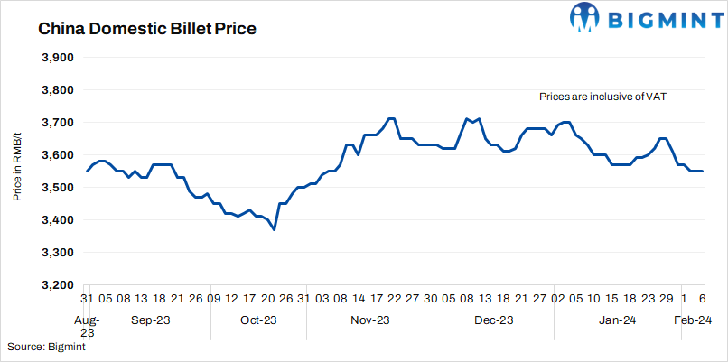 - Billet prices in Tangshan remained stable d-o-d at RMB 3,550/t ($499/t) on 6 Feb’24. Prices include 13% VAT.