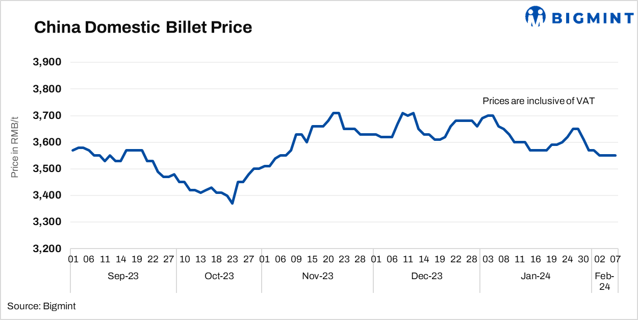 - Billet prices in Tangshan remained stable for third straight day at RMB 3,550/t ($499/t) on 7 Feb’24. Prices include 13% VAT.