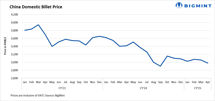 • Steel billet prices in China’s Tangshan increased by RMB 10/t ($1/t) to RMB 2,990/t ($410/t), including 13% VAT, on 28 Apr’25 as against 25 April.