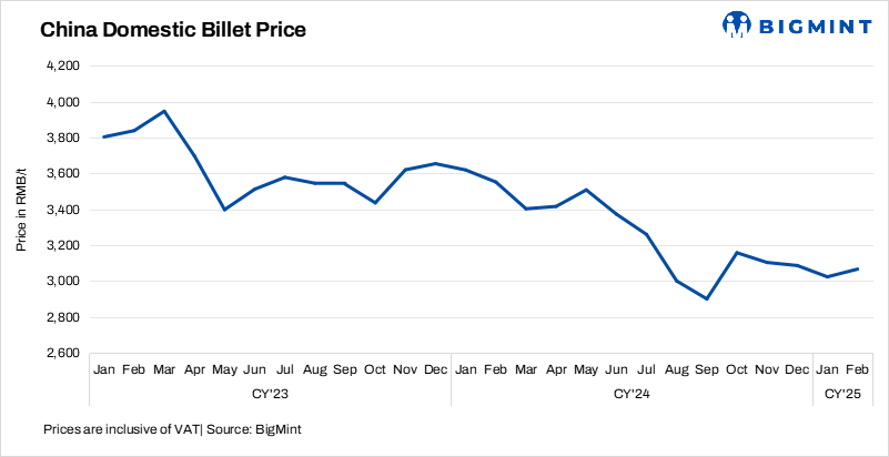 - Steel billet prices in China’s Tangshan rose d-o-d by RMB 3,130/t ($431/t) on 21 Feb’25. Prices include 13% VAT.