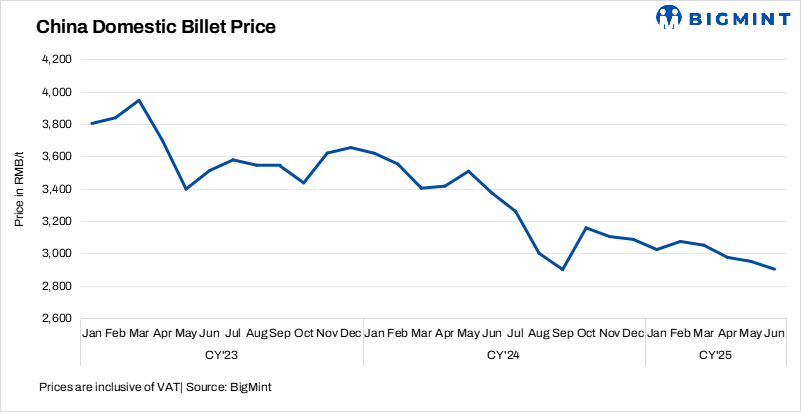 • Steel billet prices in Tangshan, China, rose by RMB 30/t ($4/t) to RMB 2,930/t ($408/t), including 13% VAT, on 16 Jun’25 against 13 Jun’25.