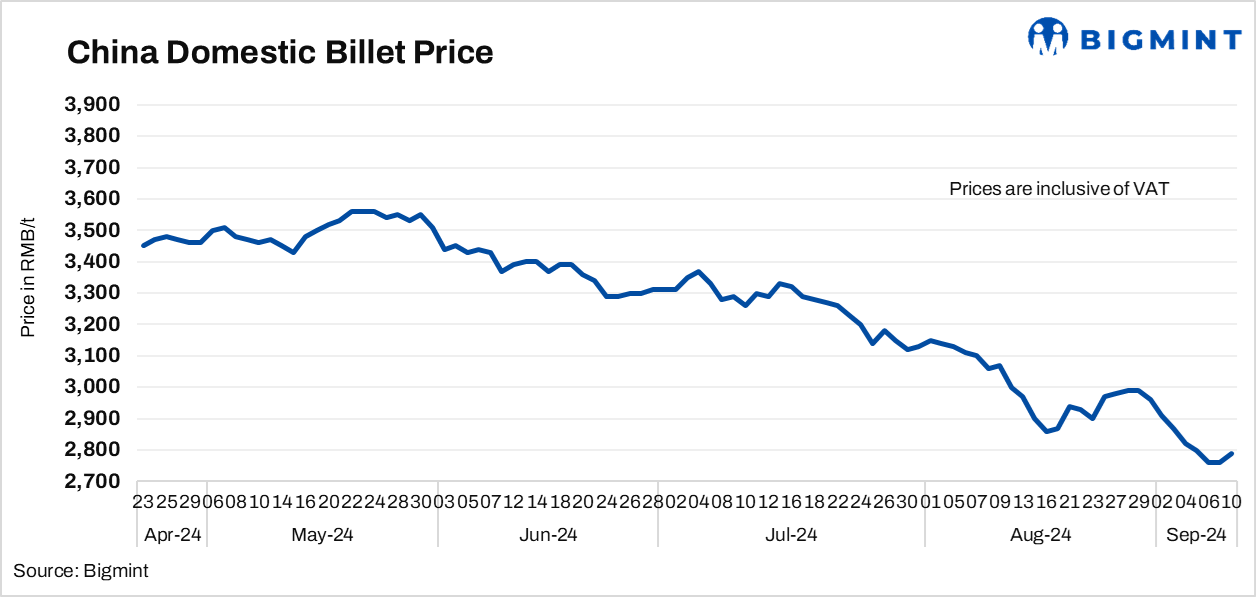 - Billet prices in Tangshan recovered by RMB 30/t ($4/t) to RMB 2,790/t ($392/t) d-o-d on 10 Sep’24. Notably, prices include 13% VAT.