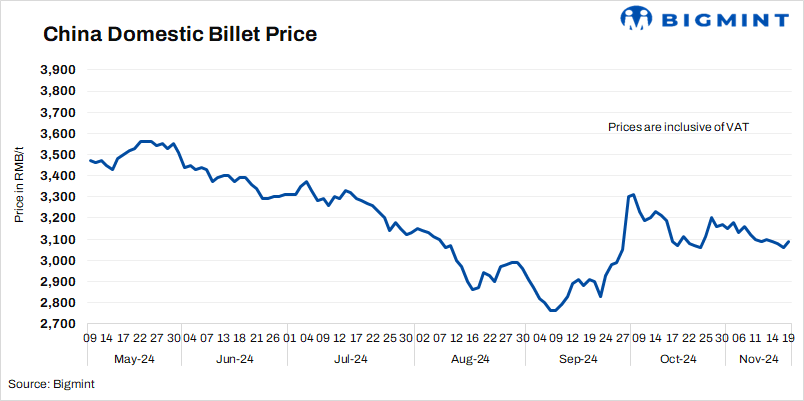 • Steel billet prices in China’s Tangshan rose by RMB 30/t ($4/t) d-o-d to RMB 3,090/t ($427/t) on 19 Nov’24. Prices include 13% VAT.