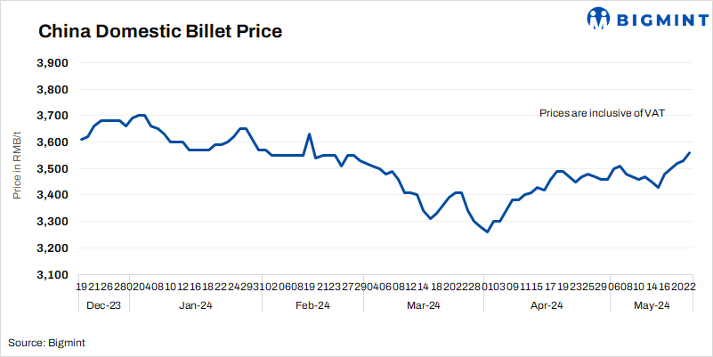 - Billet prices in Tangshan rose by RMB 30/t ($4/t) d-o-d to RMB 3,560/t ($502/t) on 22 May’24. Prices include 13% VAT.