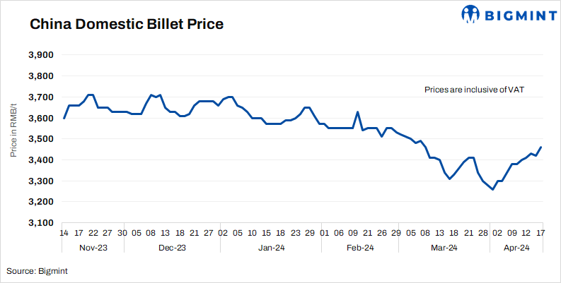 • Billet prices in Tangshan rose by RMB 40/t ($6/t) d-o-d to RMB 3,460/t ($478/t) on 17 Apr’24. Prices include 13% VAT.