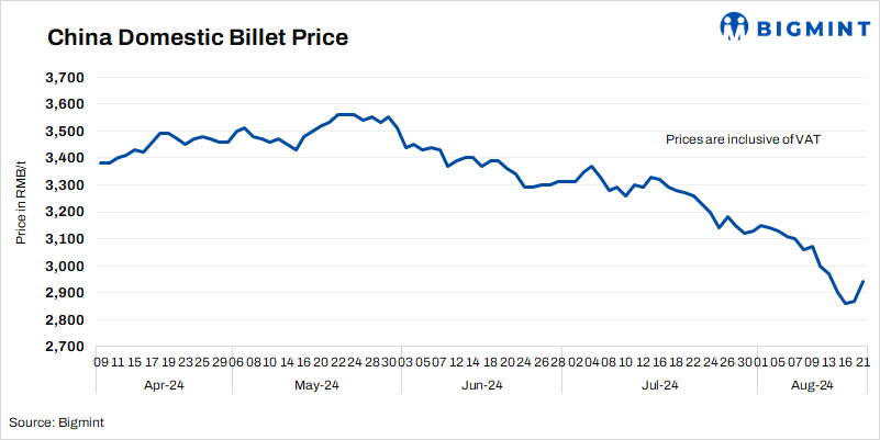 - Billet prices in Tangshan rose by RMB 70/t ($10/t) d-o-d to RMB 2,940/t ($412/t) on 21 Aug’24. Prices include 13% VAT.