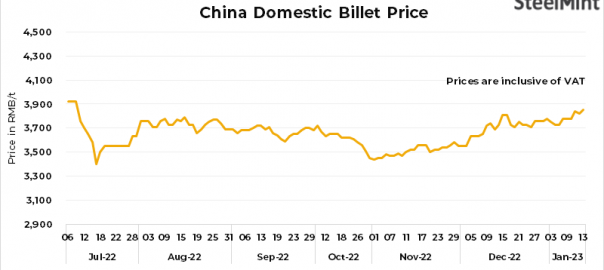 - Domestic billet prices in China’s Tangshan rose by RMB 30/t ($4/t) d-o-d to RMB 3,850/t ($572/t), inclusive of 13% VAT, on 13 Jan’23.