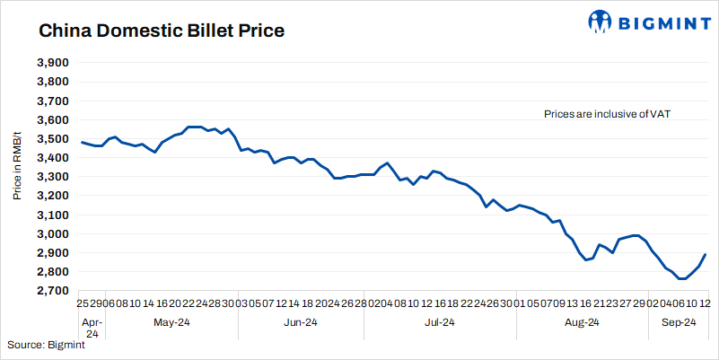 - Billet prices in Tangshan rose significantly by RMB 60/t ($8/t) to RMB 2,890/t ($406/t) d-o-d on 12 Sep’24. Prices include 13% VAT.