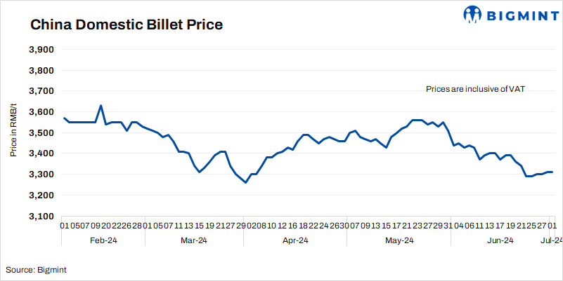 - Billet prices in Tangshan remained stable at RMB 3,310/t ($455/t) on 1 Jul’24 against 28 Jun’24. Prices include 13% VAT.