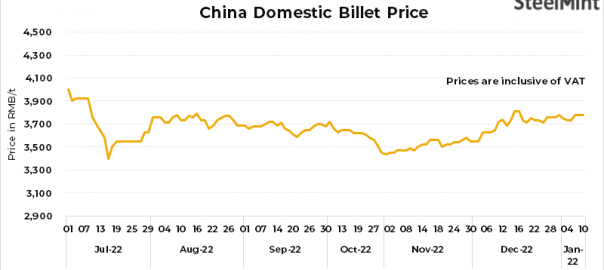 • Domestic billet prices in China’s Tangshan remained stable for the second consecutive day at RMB 3,780/t ($557/t), inclusive of 13% VAT, on 10 Jan’23.