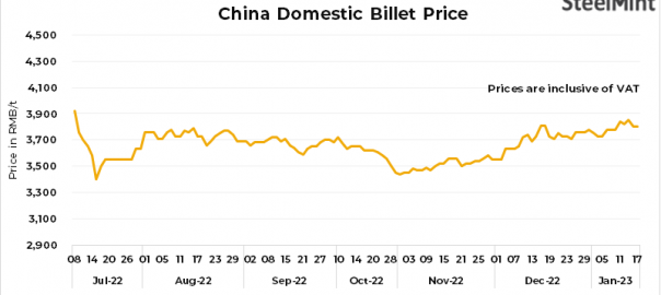 • Domestic billet prices in China’s Tangshan remained stable at RMB 3,800/t ($561/t), inclusive of 13% VAT on 17 Jan’23.