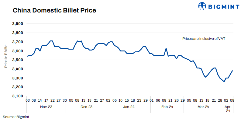- Billet prices in Tangshan rose d-o-d by RMB 40/t ($6/t) to RMB 3,380/t ($467/t) on 9 Apr’24. Prices include 13% VAT.