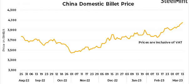 • Domestic billets prices in China’s Tangshan rose by RMB 20/t ($3/t) to RMB 4,050/t ($589/t), inclusive of 13% VAT on 13 Mar’23.