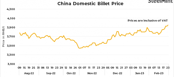 • Domestic billets prices in China’s Tangshan increased d-o-d by RMB 20/t ($3/t) to RMB 3,950/t ($573/t), inclusive of 13% VAT on 23 Feb’23.