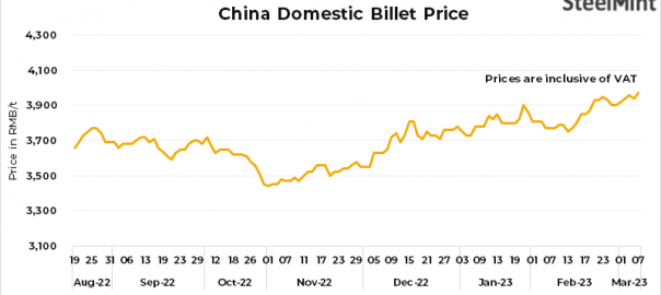 - Domestic billets prices in China’s Tangshan rose by RMB 30/t ($4/t) d-o-d to RMB 3,970/t ($572/t), inclusive of 13% VAT, on 7 Mar’23.