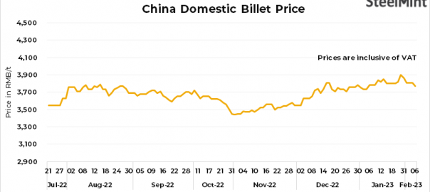 • Domestic billets prices in China’s Tangshan fell by RMB 40/t ($6/t) d-o-d to RMB 3,770/t ($556/t), inclusive of 13% VAT, on 6 Feb’23.