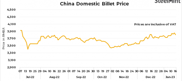 • Domestic billets prices in China’s Tangshan fell by RMB 50/t ($7/t) to RMB 3,800/t ($564/t), inclusive of 13% VAT, on 16 Jan’23.