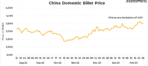 Steel billets prices in China’s Tangshan remained stable at RMB 3,900/t ($562/t), inclusive of 13% VAT on 28 Feb’23. According to data maintained with SteelMint, China’s SHFE rebars futures contract for May’23 delivery closed today at RMB 4,174/t ($602/t), a decrease of RMB 17/t ($2/t) d-o-d.