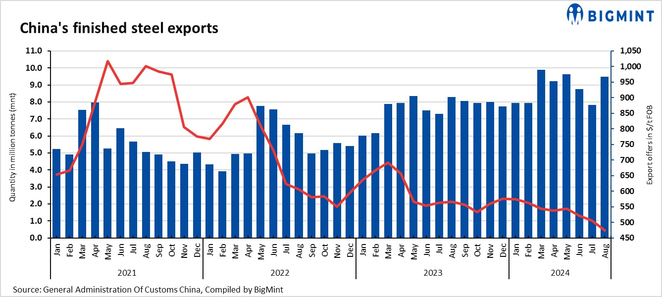 Competitive export offers: China’s steel export offers remained lower compared to those from other regions. For instance, China’s steel export offers in July stood at $474/tonne (t) FOB, whereas Japanese offers were at $525/t FOB. This competitive pricing has boosted China’s steel export volumes. Meanwhile, Indian steel producers concentrated on domestic demand in August, resulting in a decline in their export volumes.