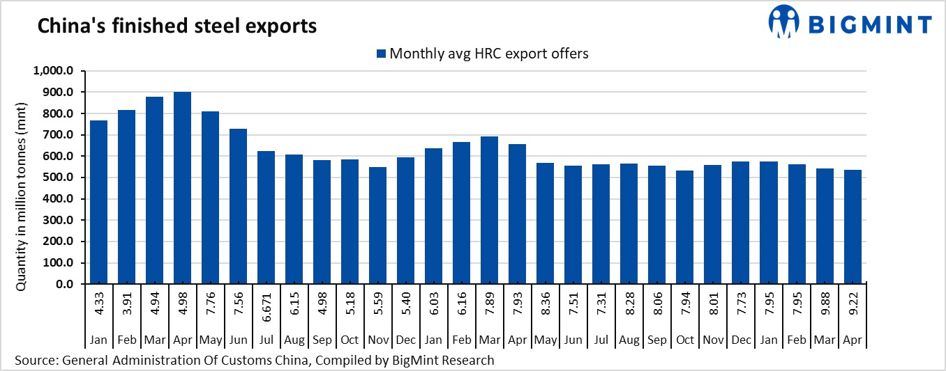 Meanwhile, China’s HRC FOB export offers remained very competitive to $537/t FOB in April. While, India’s HRC FOB offers were around $ 562/t FOB, Japanese HRC offers were at $561/t FOB. Cheaper export offers from China compared to other exporting origins resulted in higher export volumes in China. Notably, Chinese mills were also offering HRC to India at around $564/t CNF West Coast India as Indian mills increased domestic HRC prices and a few deals were heard reported at a similar price range, sources informed BigMint.