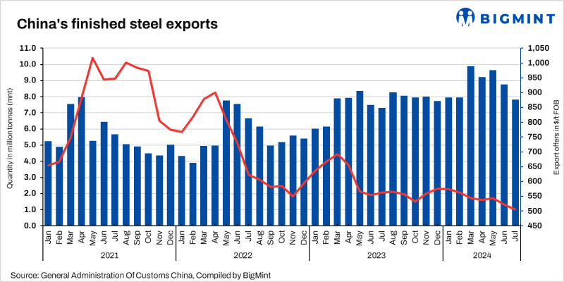 China: Steel exports rise 7% y-o-y in July’24
