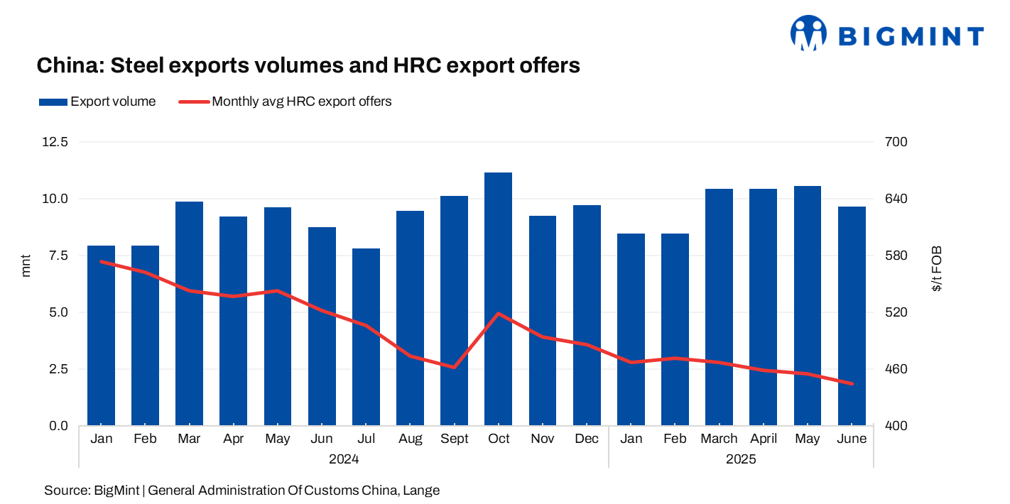 For instance, the monthly average export offers for Chinese-origin hot-rolled coils (HRC) dropped to $445/tonne (t) FOB Rizhao in June 2025, down by $10/t m-o-m and $22.5/t from January 2025. On a y-o-y basis, the same is about $77/t lower as compared to $522/t FOB in June 2024.