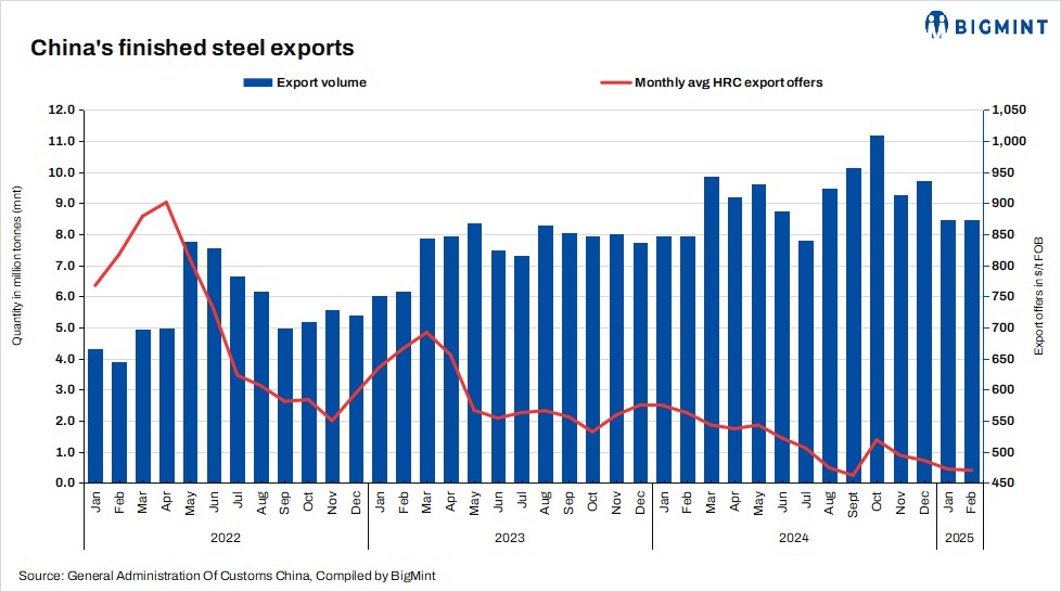 Competitive export offers: Chinese steel exports maintained their competitive edge in terms of pricing, outperforming other origins. In January, Chinese export offers were quoted at $472/t FOB, and in February, they stood at $470/t FOB. Notably, these prices were substantially lower than India’s export offers, which were $505/t FOB in January and $495/t FOB in February.