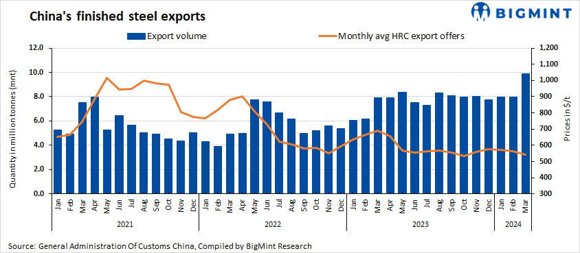 China’s steel export volume in March reached nearly 10 mnt, a new high in more than seven years and it is expected to remain on the higher side. China’s steel exports appear positive, but long-term sustainability will depend on various global economic factors and steel production levels in other countries.