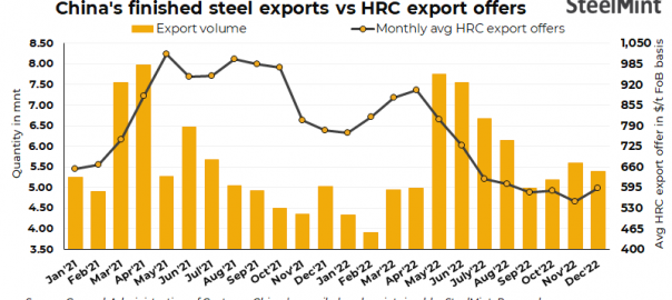 China’s steel exports rose 49% y-o-y to 12.19 mnt in Jan-Feb’23 period compared to 8.18 mnt in the same period last year, as per General Administration of Customs data. Export volumes increased mainly due to the recovery in global demand. In addition, Chinese mills offered competitive prices compared to steel from other origins.