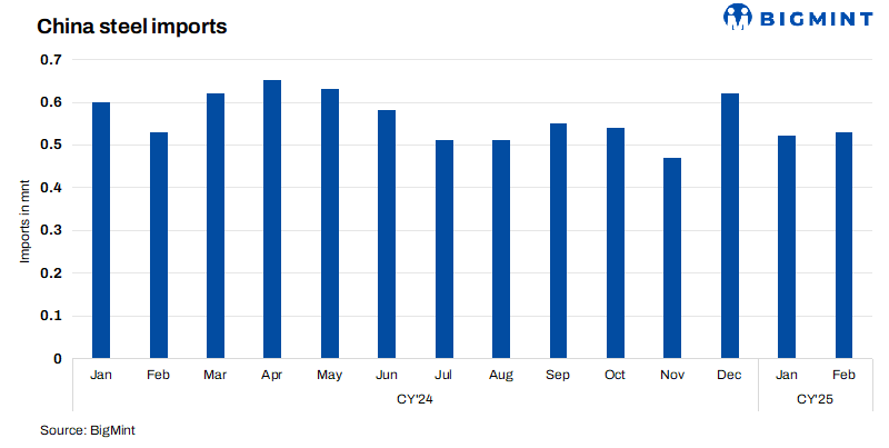 - China’s steel imports fell 7% to 1.05 mnt in Jan-Feb’25 from 1.13 mnt in the same period last year, as per General Administration of Customs data.