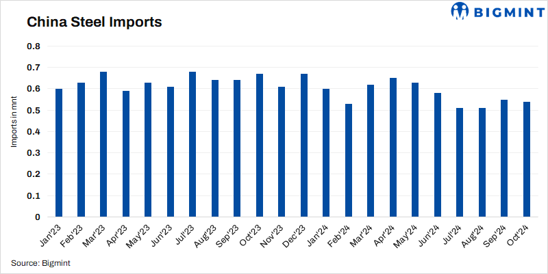 • China’s steel imports dipped 10% y-o-y to 5.72 mnt in Jan-Oct’24 as against 6.37 mnt in the year-ago period, according to General Administration of Customs data.