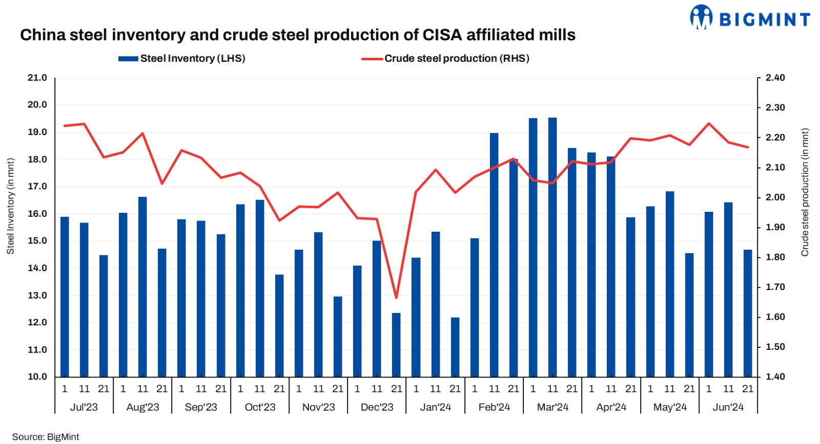 China: Steel inventories at CISA-affiliated mills decline in late-Jun’24