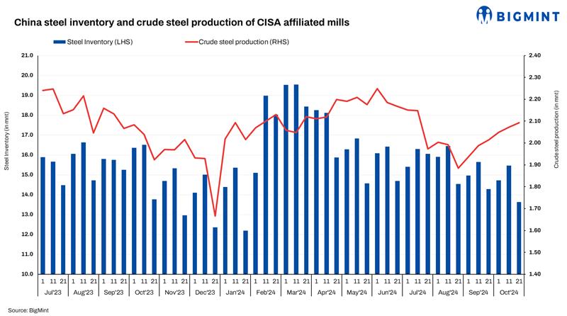 The average daily crude steel output of CISA-affiliated mills stood at 2.093 mnt in late-October, an increase of 1% compared with 2.072 mnt in mid-October. Moreover, output rose by 4% m-o-m from 2.014 mnt in late-September. Furthermore, the same hiked by 8.8% y-o-y from 1.924 in late-October 2023.