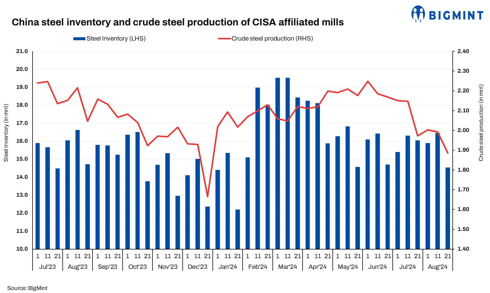 The average daily crude steel output of CISA-affiliated mills stood at 1.885 mnt in late August 2024, a decrease of 5.42% against 1.993 mnt in mid-August. Moreover, output declined by 4.5% m-o-m, compared to 1.973 mnt in late July 2024, and 7.83% y-o-y, as against 2.046 mnt in late August 2023.