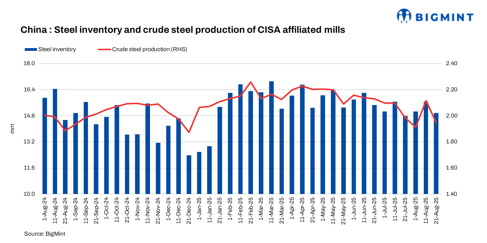 The average daily crude steel output of CISA-affiliated mills stood at 1.947 mnt in late-August, down by 7.9% from 2.115 t in mid-August. Additionally, the same has dropped by 1.8% from 1.982 mnt in mid-August 2024.