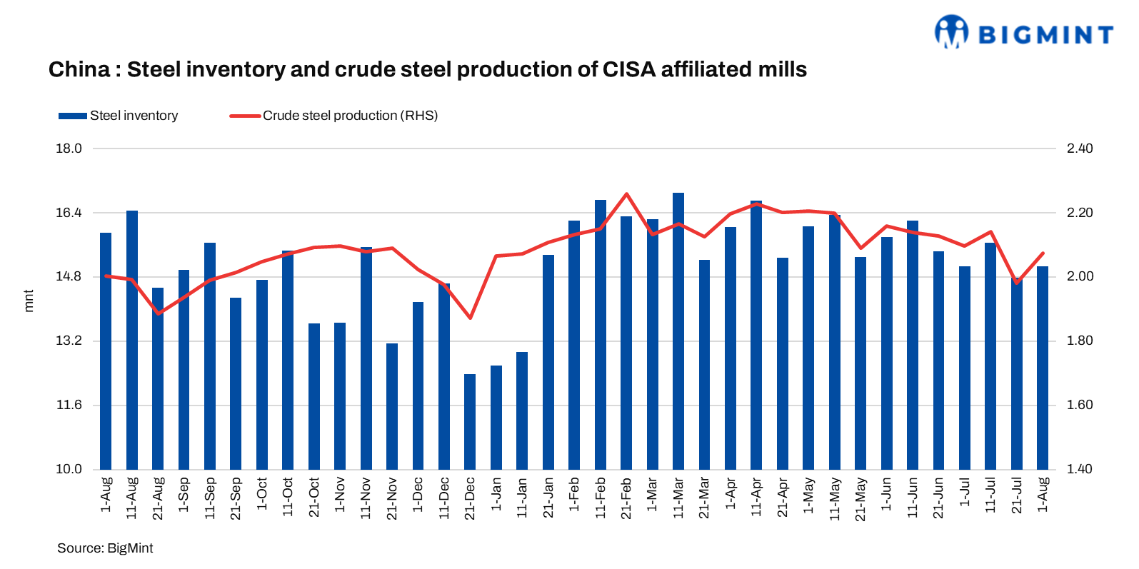 The average daily crude steel output of CISA-affiliated mills stood at 2.074 mnt in early-August, up by 4.7% from 1.98 mnt in late-July. Additionally, the same was up by 3.6% y-o-y.