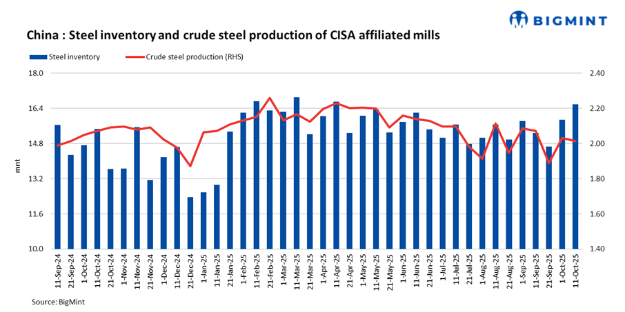 The China Iron and Steel Association (CISA) has announced that the total steel inventory at key Chinese enterprises in mid-October 2025 stood at 16.58 million tonnes (mnt), representing an increase of 700,000 tonnes (t) or 4.4% as compared to 15.88 mnt in early-October. Moreover, inventory levels rose by 1.29 mnt or 8.4% from 15.29 mnt against early-September. Meanwhile, inventories increased by 1.15 mnt or 7.5% compared to 15.46 mnt last year.