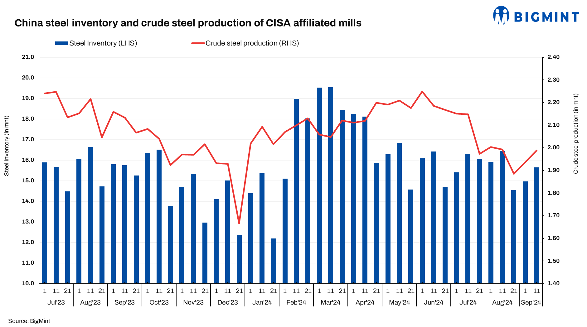 The average daily finished steel output stood at 1.93 mnt, up by 3.6% from 1.86 mnt in early September 2024. However, the same dropped by 8.3% y-o-y.