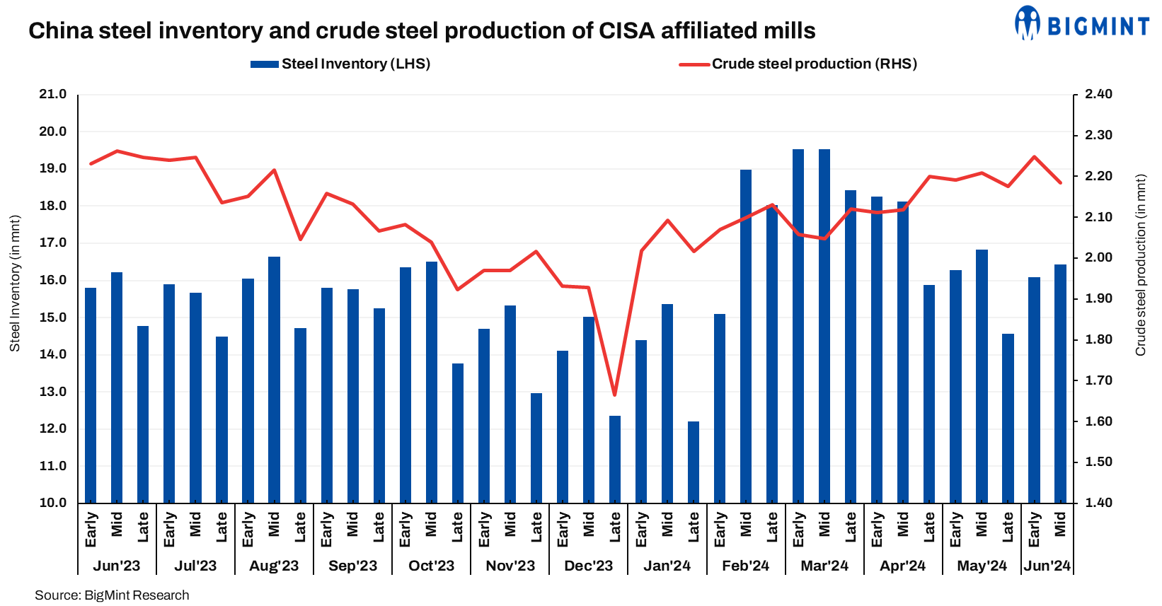 The China Iron and Steel Association (CISA) reported total steel inventory of key enterprises in mid-June 2024 at 16.425 million tonnes (mnt), up by 339,500 tonnes (t) or 2.11% compared to 16.086 mnt in early-June. However, inventory decreased by 400,600 t or 2.38% m-o-m compared with 16.826 mnt in mid-May 2024. Moreover, the same rose by 203,800 t or 1.26% y-o-y compared to 16.222 mnt in mid-June 2023.