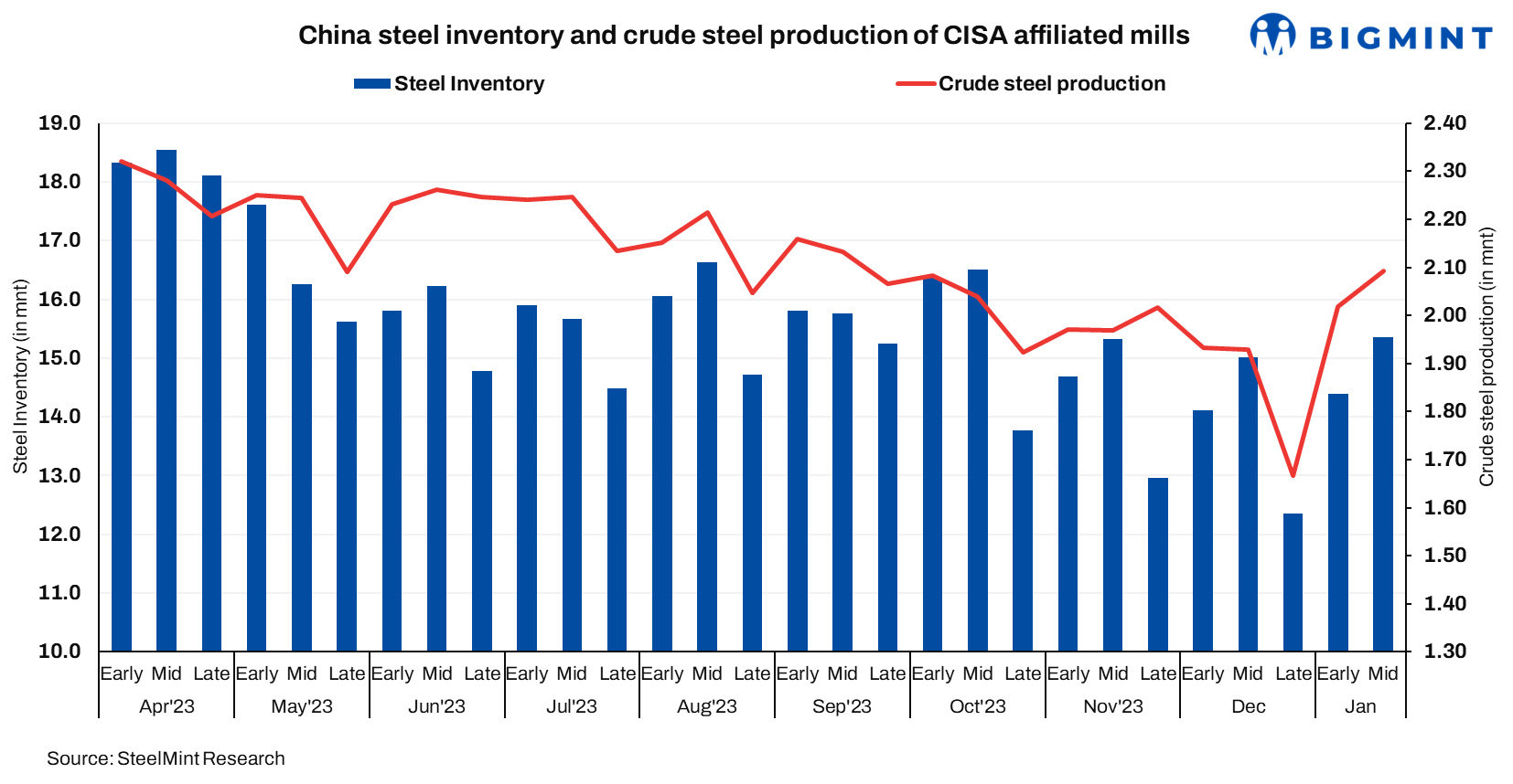China: Steel inventories at CISA mills continue upward trend in mid-Jan’24