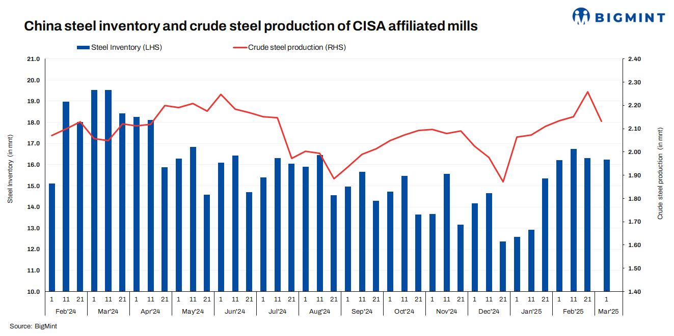 The average daily crude steel output of CISA-affiliated mills touched 2.132 mnt in early-March, declining by 5.6% compared to 2.259 mnt in late-February.