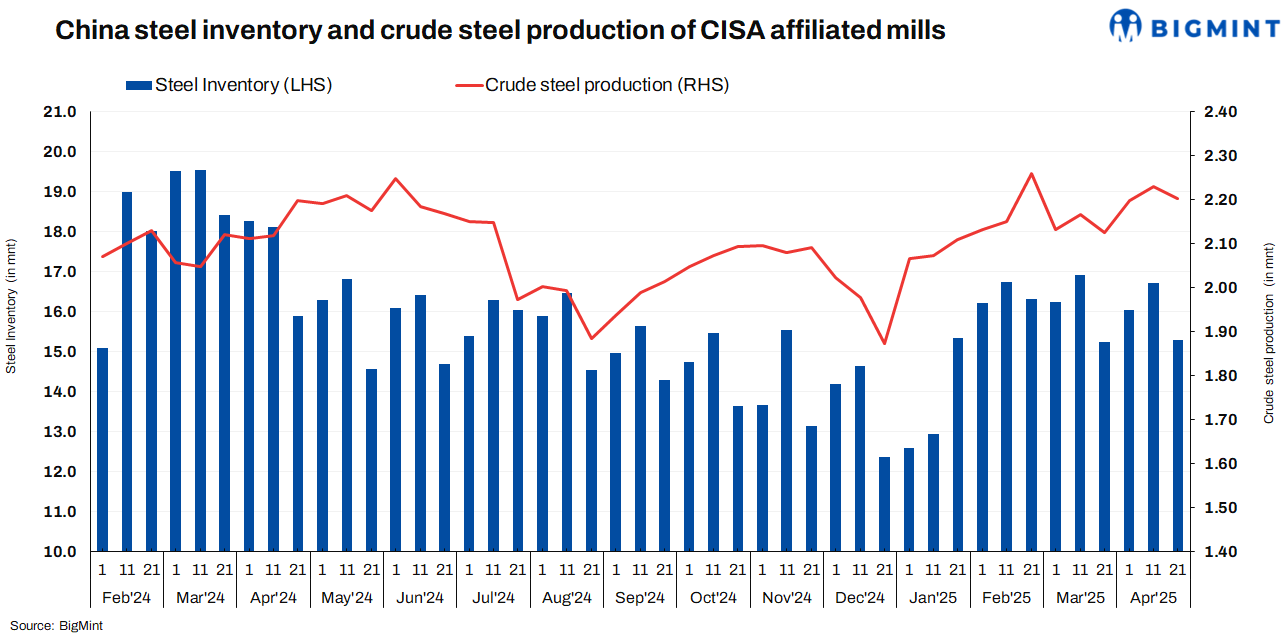 The China Iron and Steel Association (CISA) has announced that the total steel inventory at key Chinese enterprises stood at 15.29 million tonnes (mnt) in late-April 2025. Inventory levels decreased by 1.42 mnt or 8.5% from 16.71 mnt in mid-April 2025. However, the inventory inched up by 60,000 tonnes (t) or 0.4% m-o-m from 15.23 mnt in late-march. Y-o-y, steel inventories declined by 590,000 t or 3.7% compared to 15.88 mnt in late-April 2024.