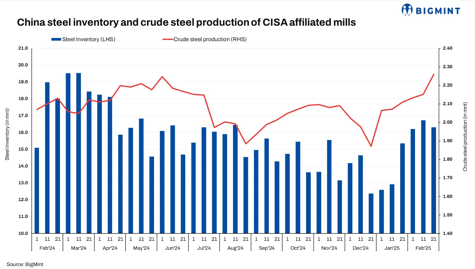 The average daily crude steel output of CISA-affiliated mills touched 2.259 mnt in late-February 2025, edging up by 5% as compared 2.151 mnt in mid-February 2025.