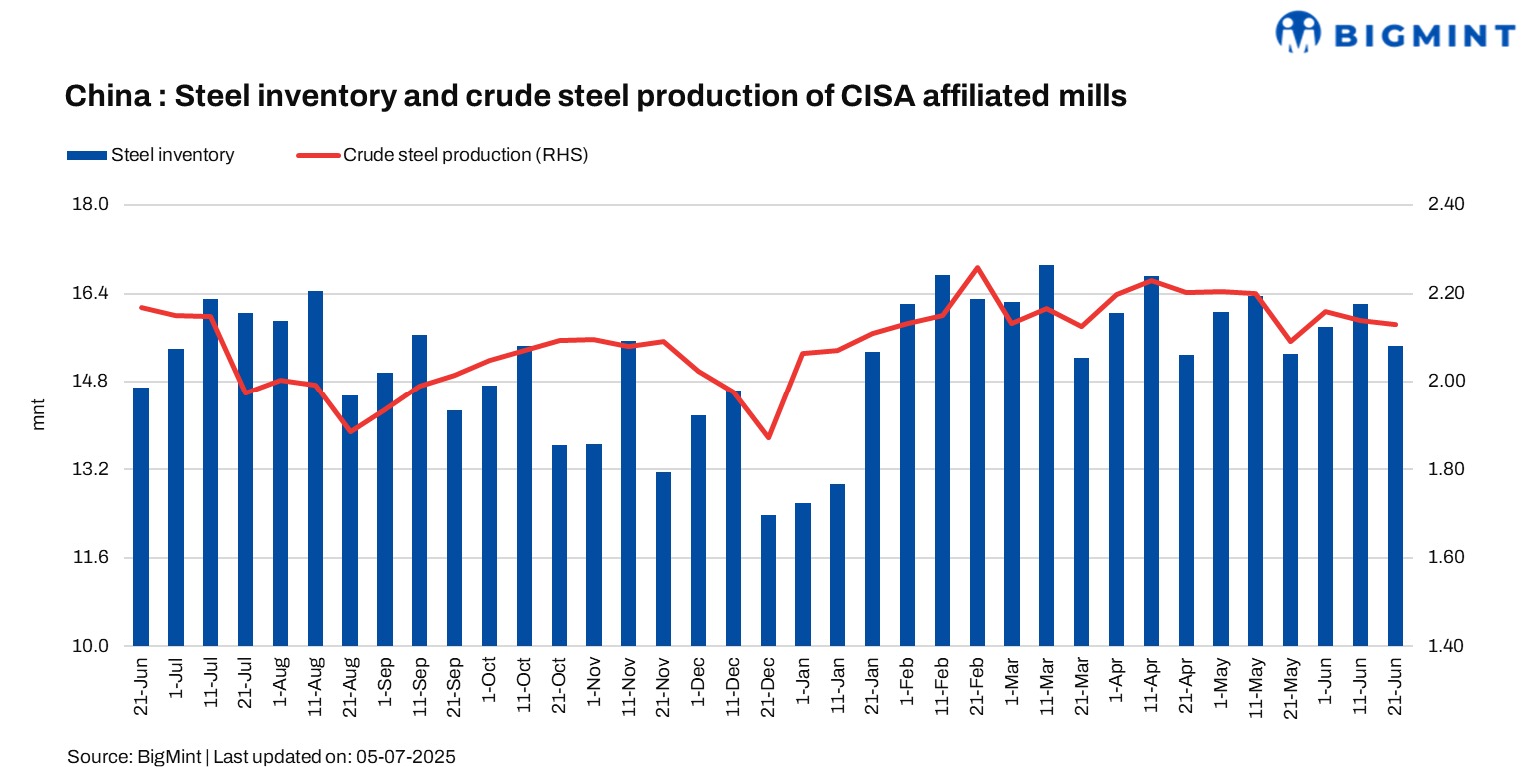 The China Iron and Steel Association (CISA) has announced that the total steel inventory at key Chinese enterprises in late-June 2025 stood at 15.45 million tonnes (mnt), down by 760,000 tonnes (t) or 4.7% as compared to 16.21 mnt in mid-June 2025. Meanwhile, steel inventories increased by 150,000 t or 1% m-o-m from 15.3 mnt a month ago. Moreover, inventories rose by 760,000 t or 5.2% y-o-y from 14.69 mnt a year ago.
