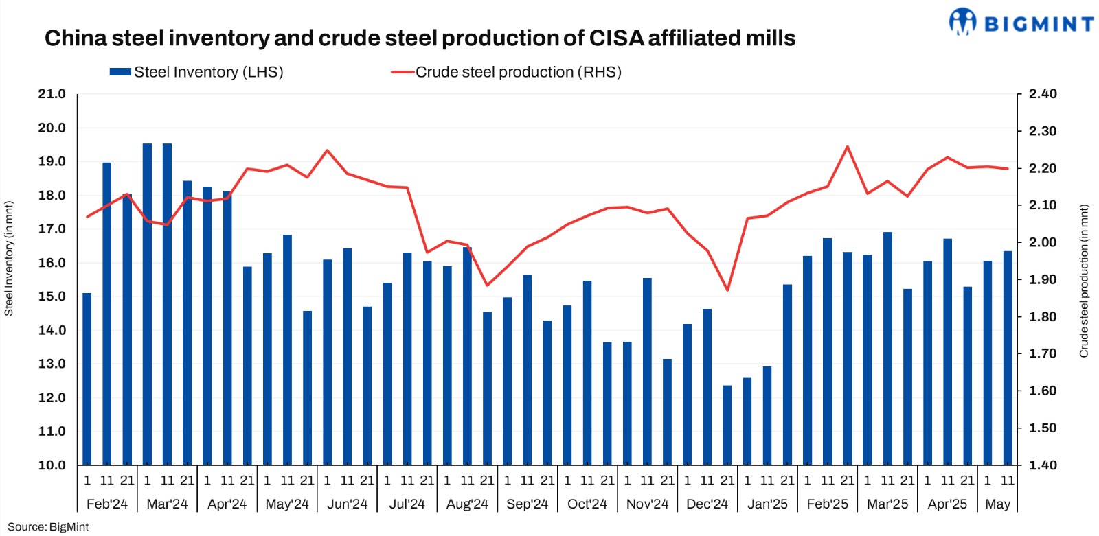The average daily crude steel output of CISA-affiliated mills stood at 2.199 mnt in mid-May, inching down by 0.3% against 2.205 mnt in early-May. Moreover, the same edged down by 0.5% y-o-y against 2.209 mnt in mid-May 2024.